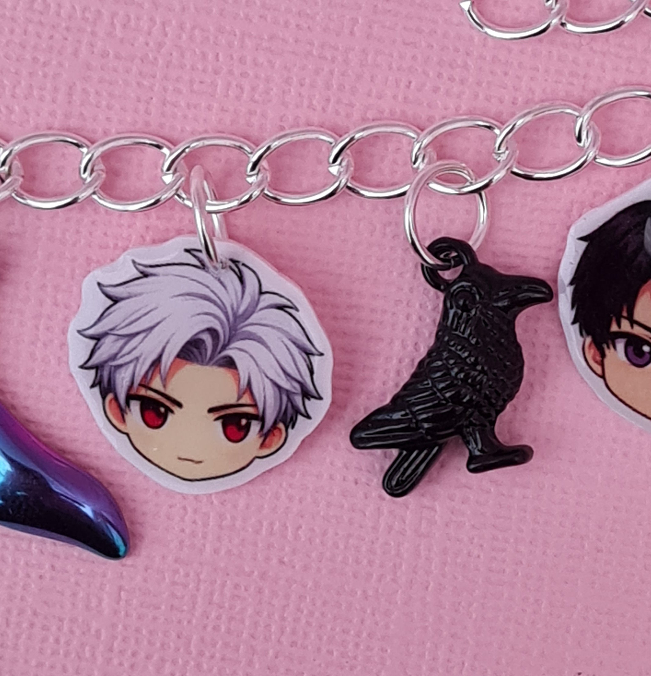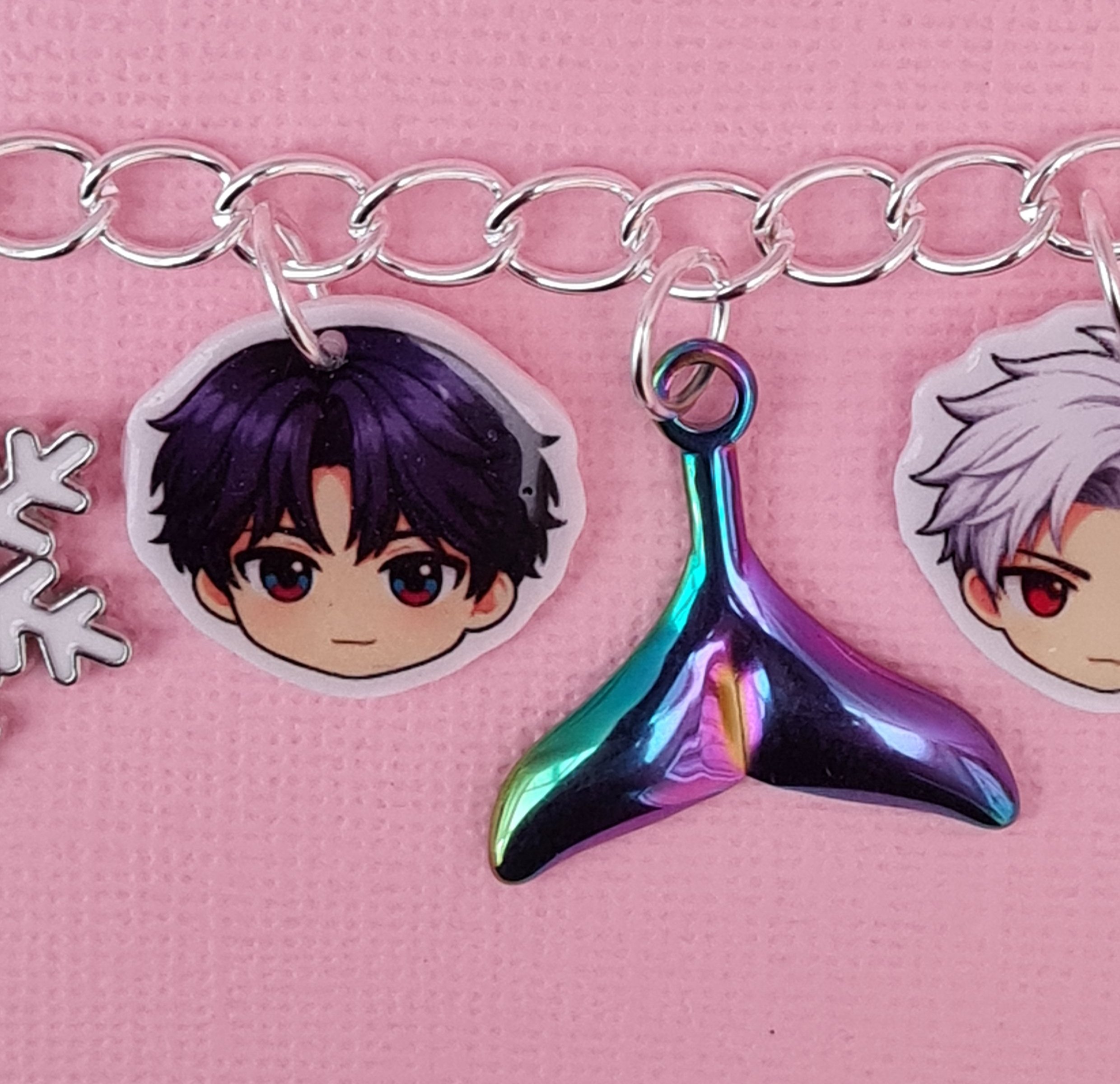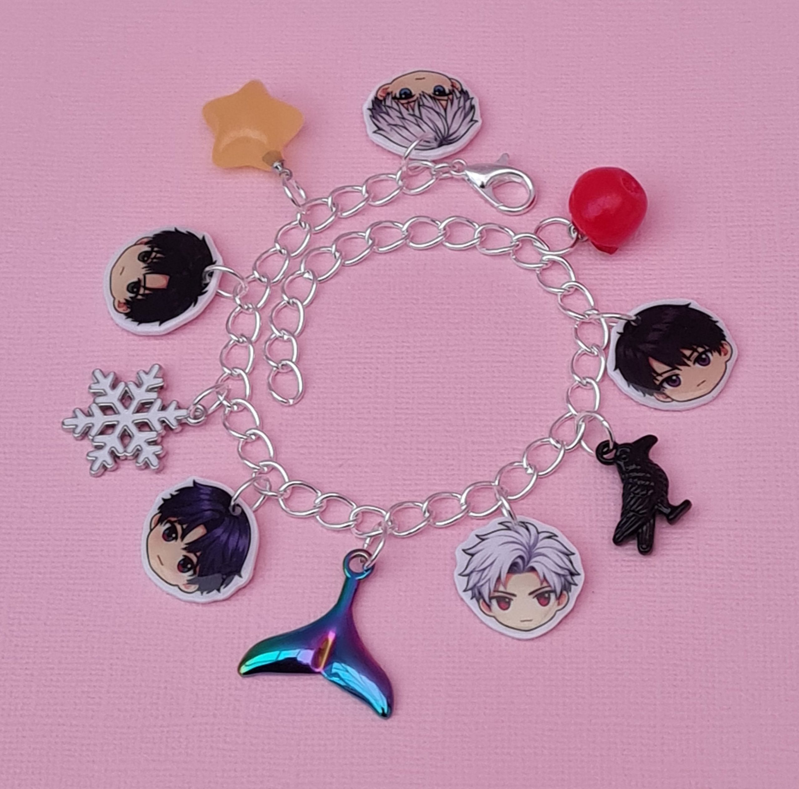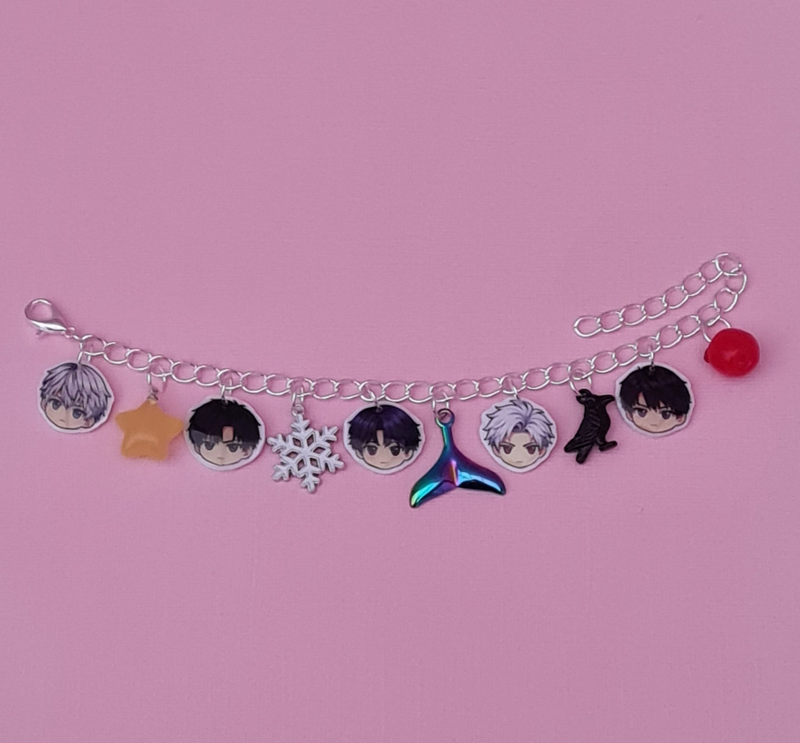 They are attached to a silver plated (nickle free) 7.5″ charm bracelet with a 2″ adjustable chain.