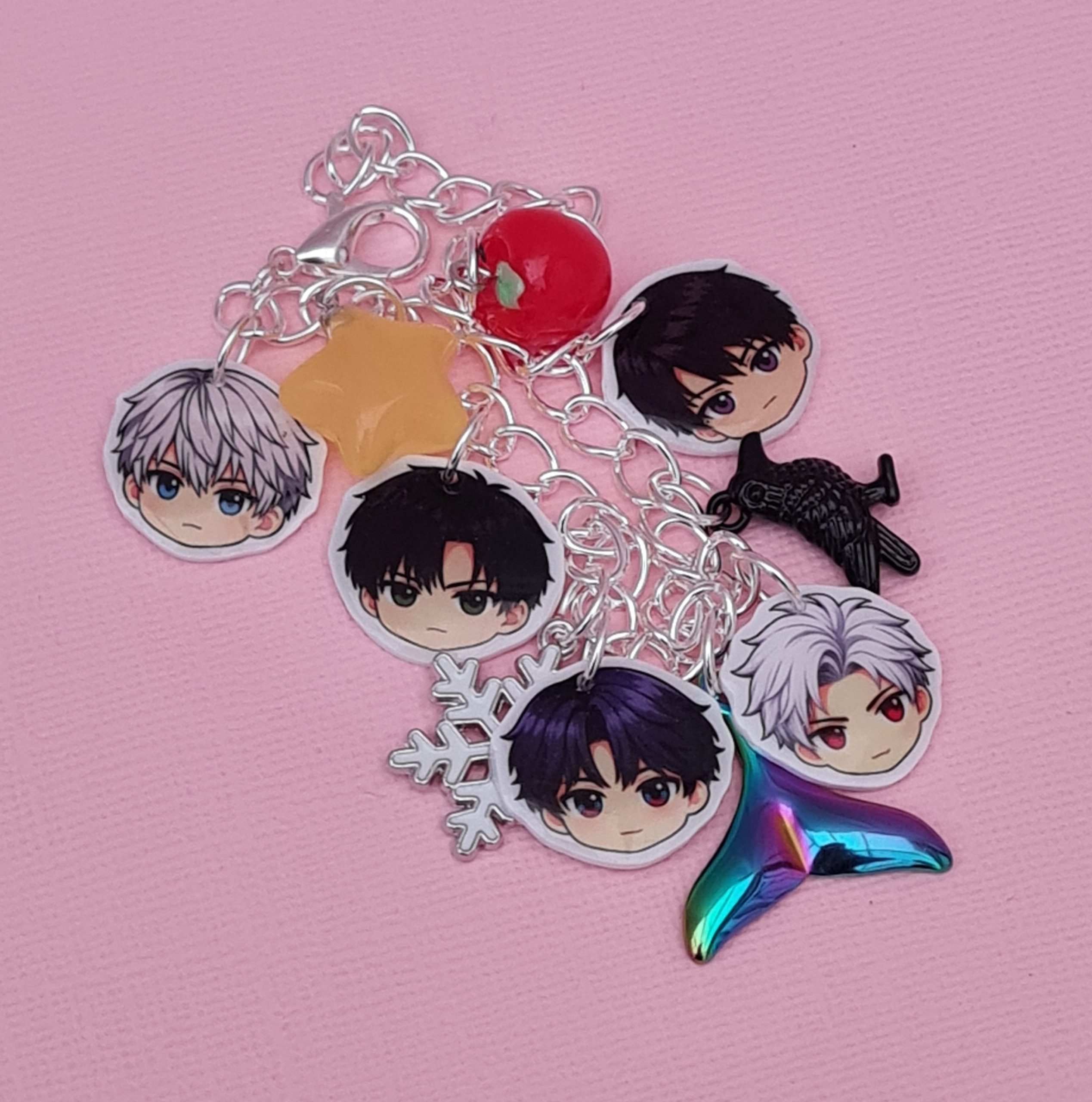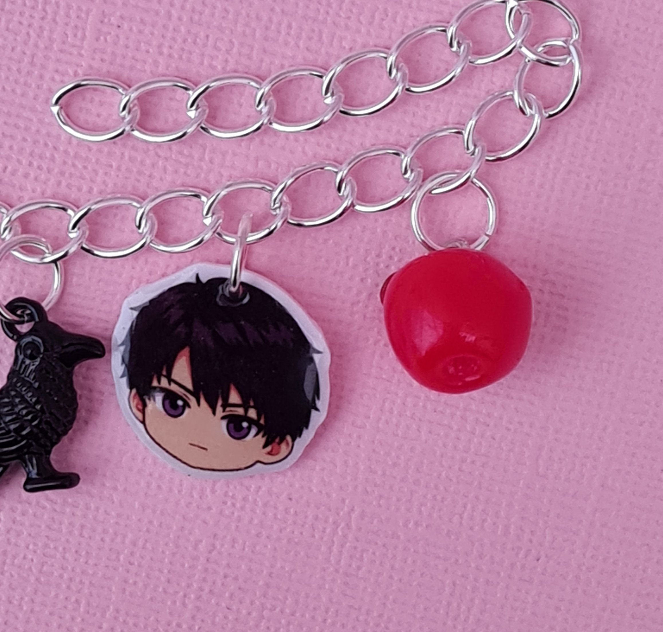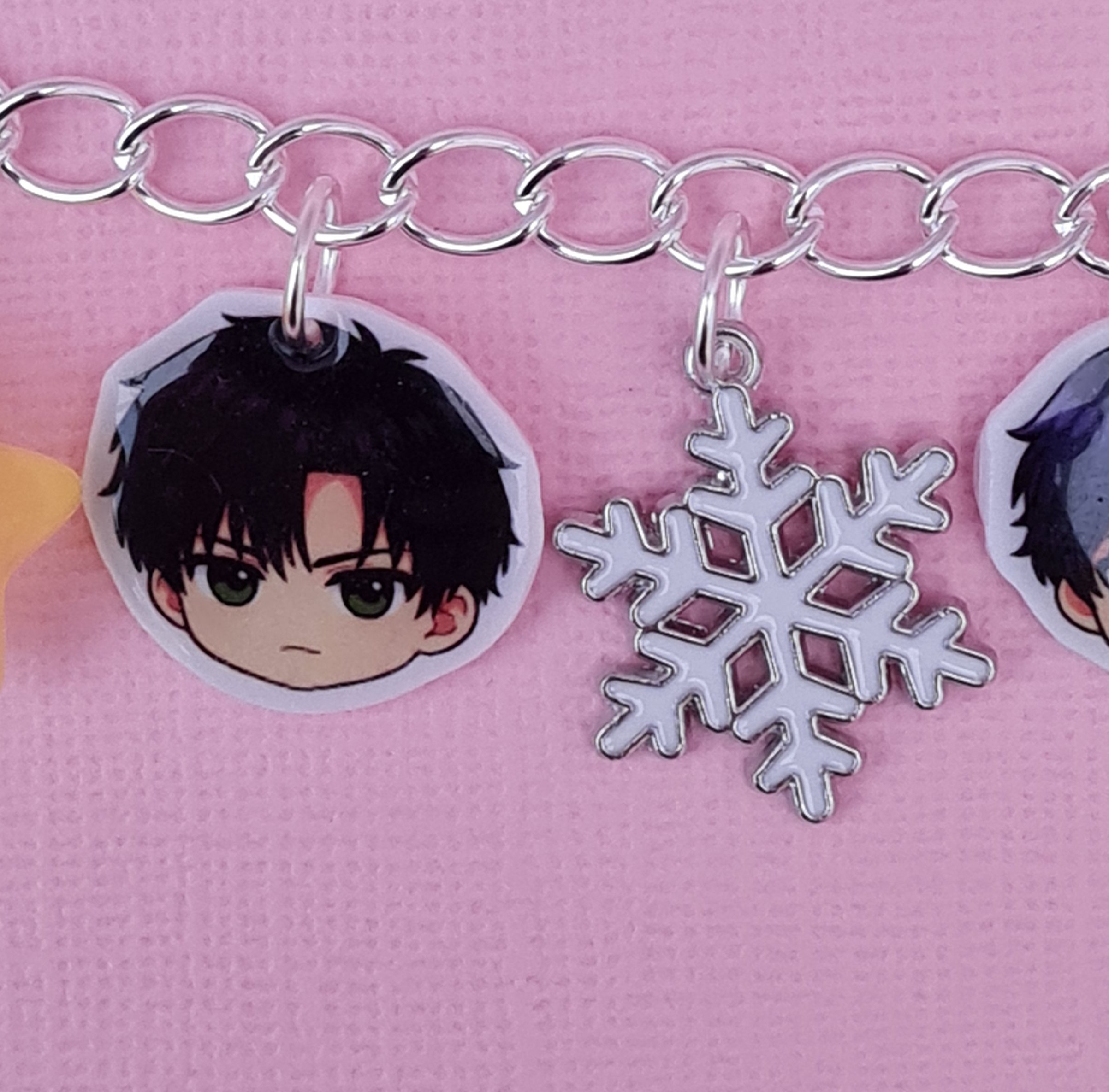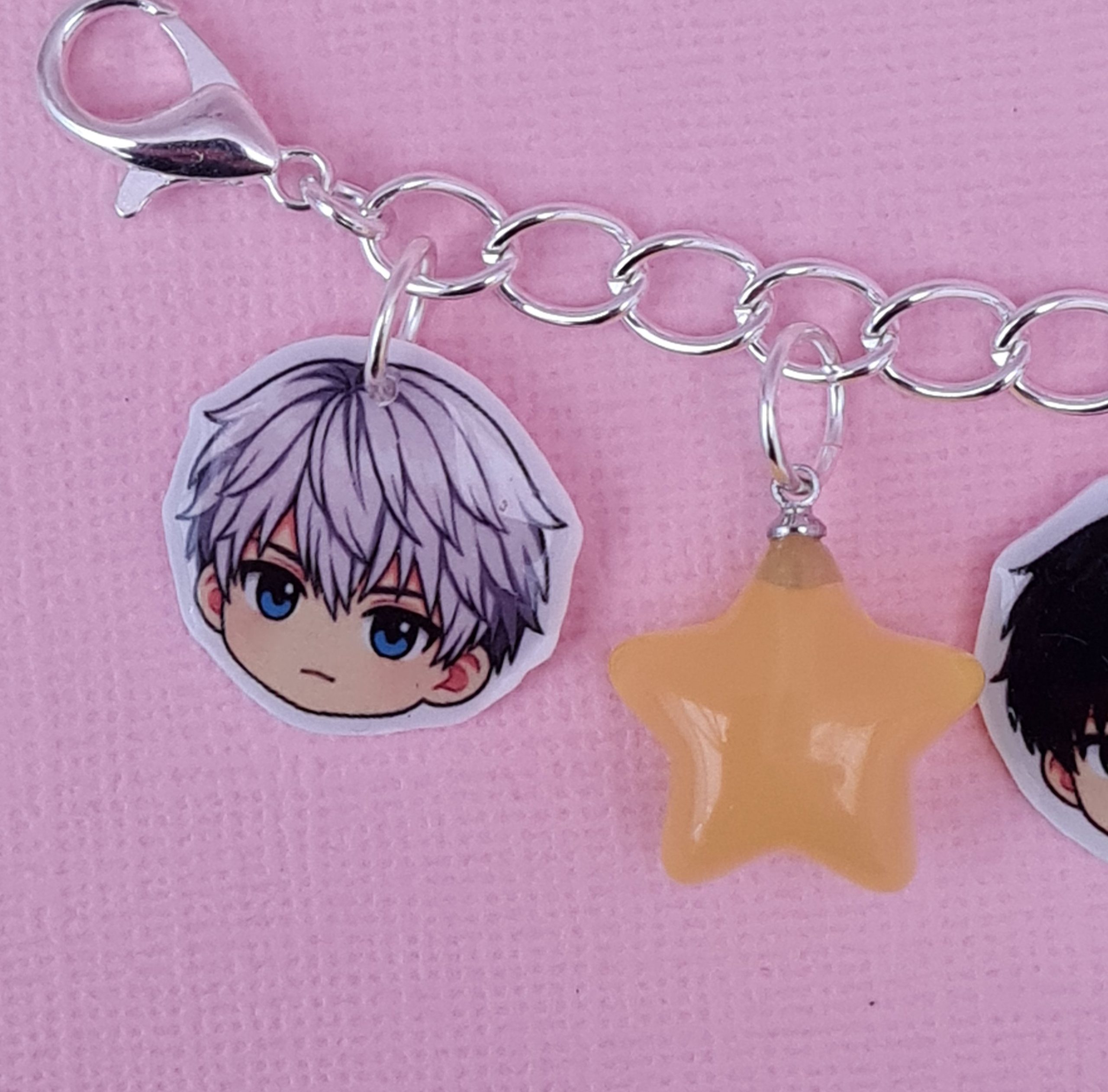 They are attached to a silver plated (nickle free) 7.5″ charm bracelet with a 2″ adjustable chain.