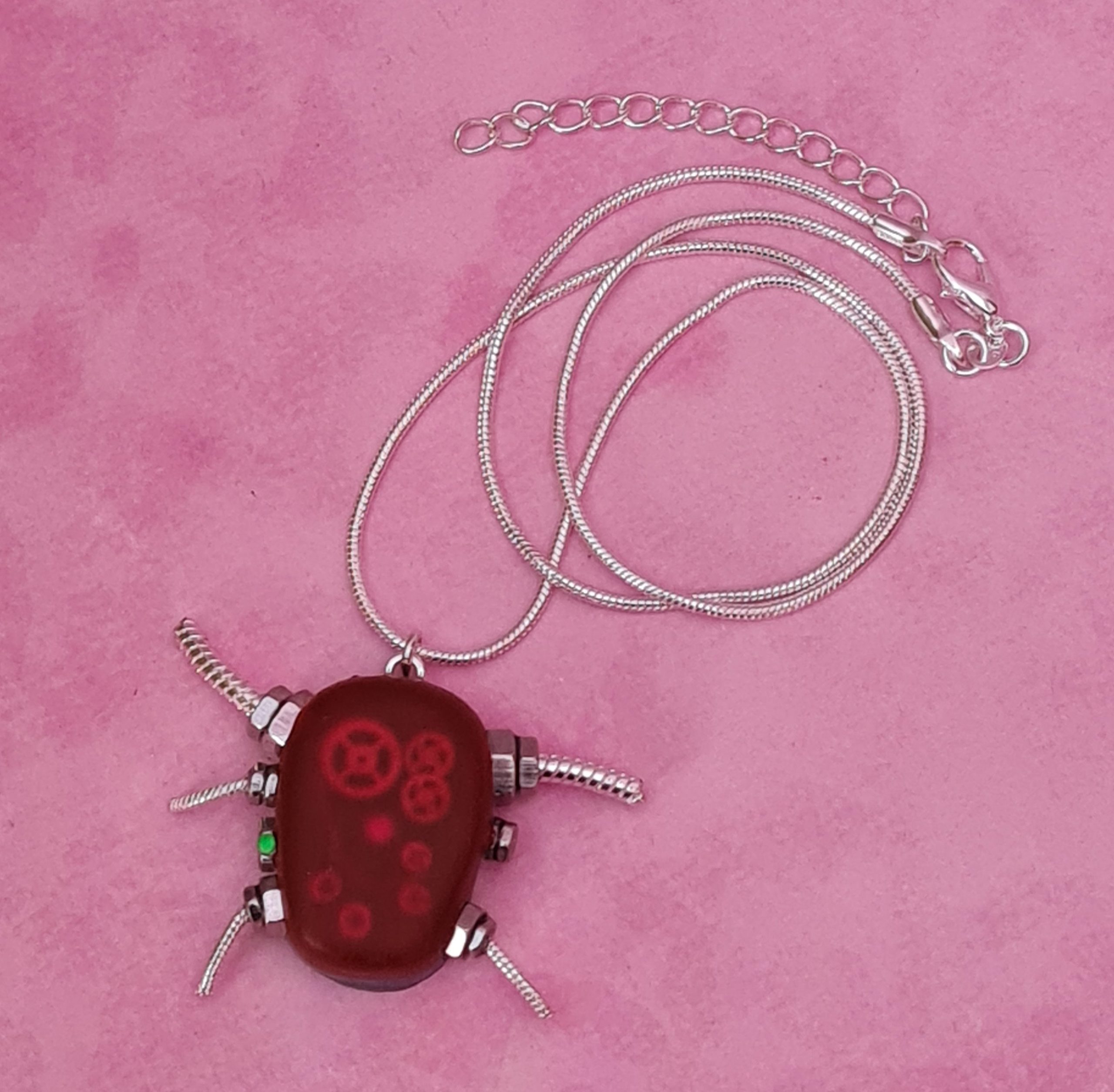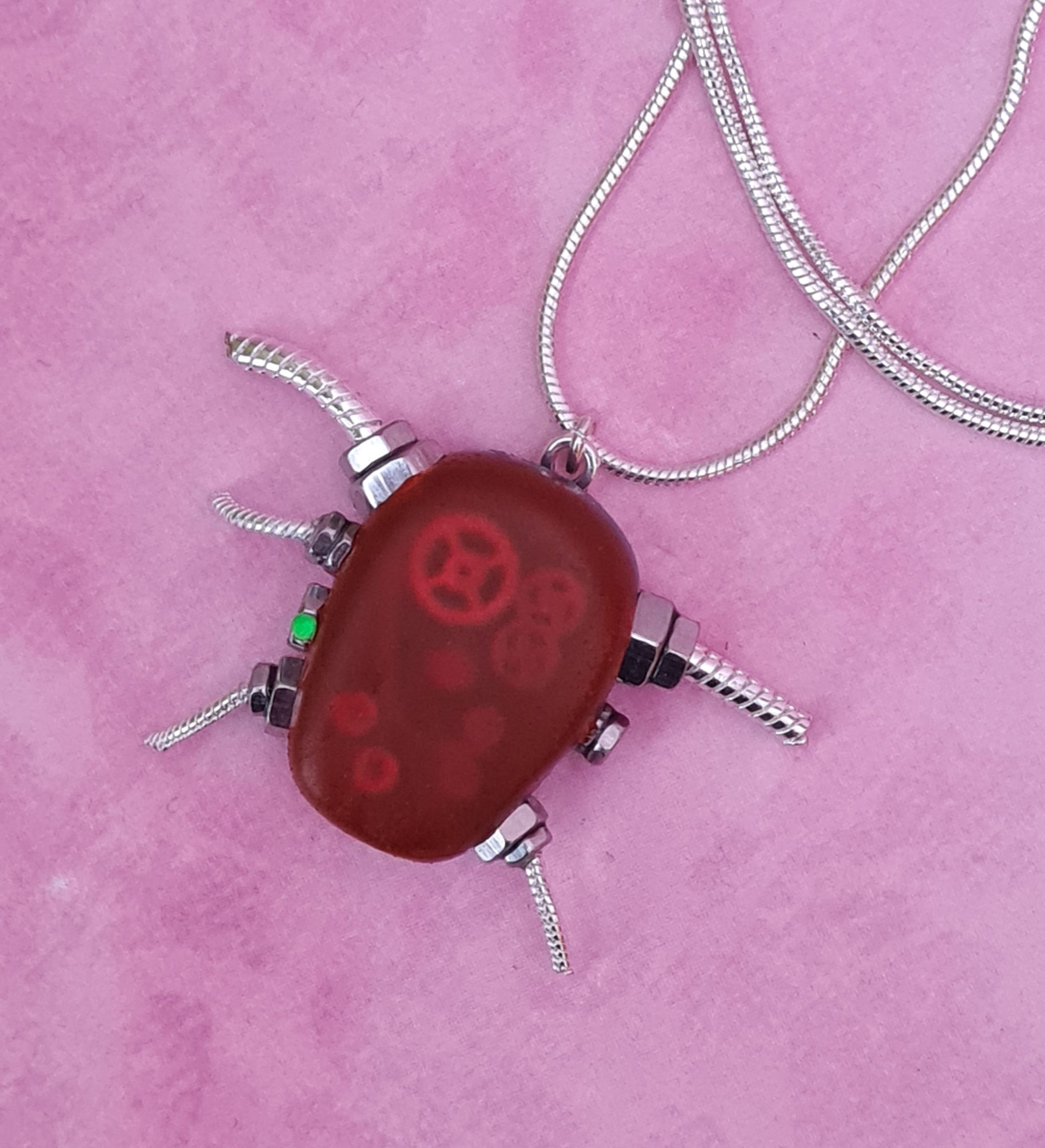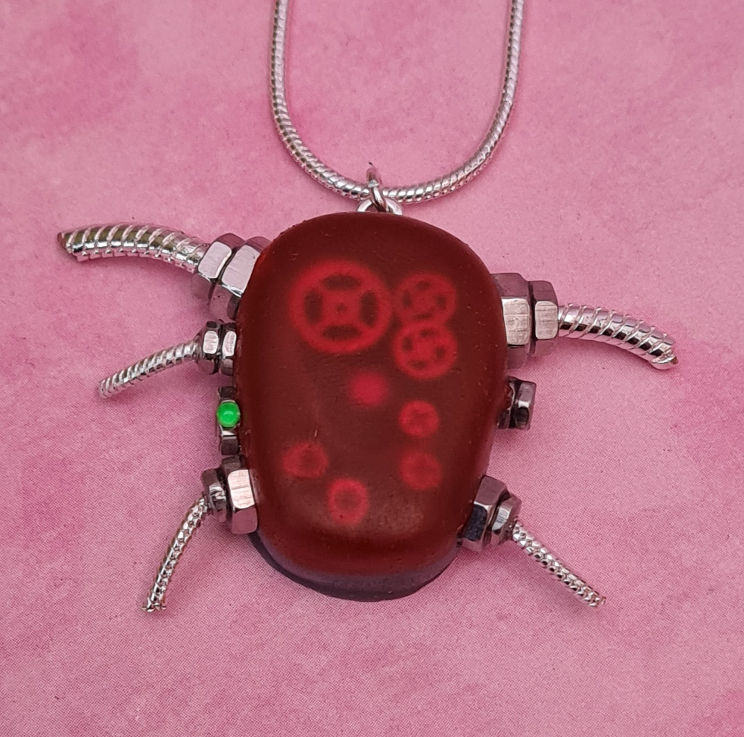 The pendant is dull red at first sight but as it catches the light at an angle, you can see the mechanical workings inside.