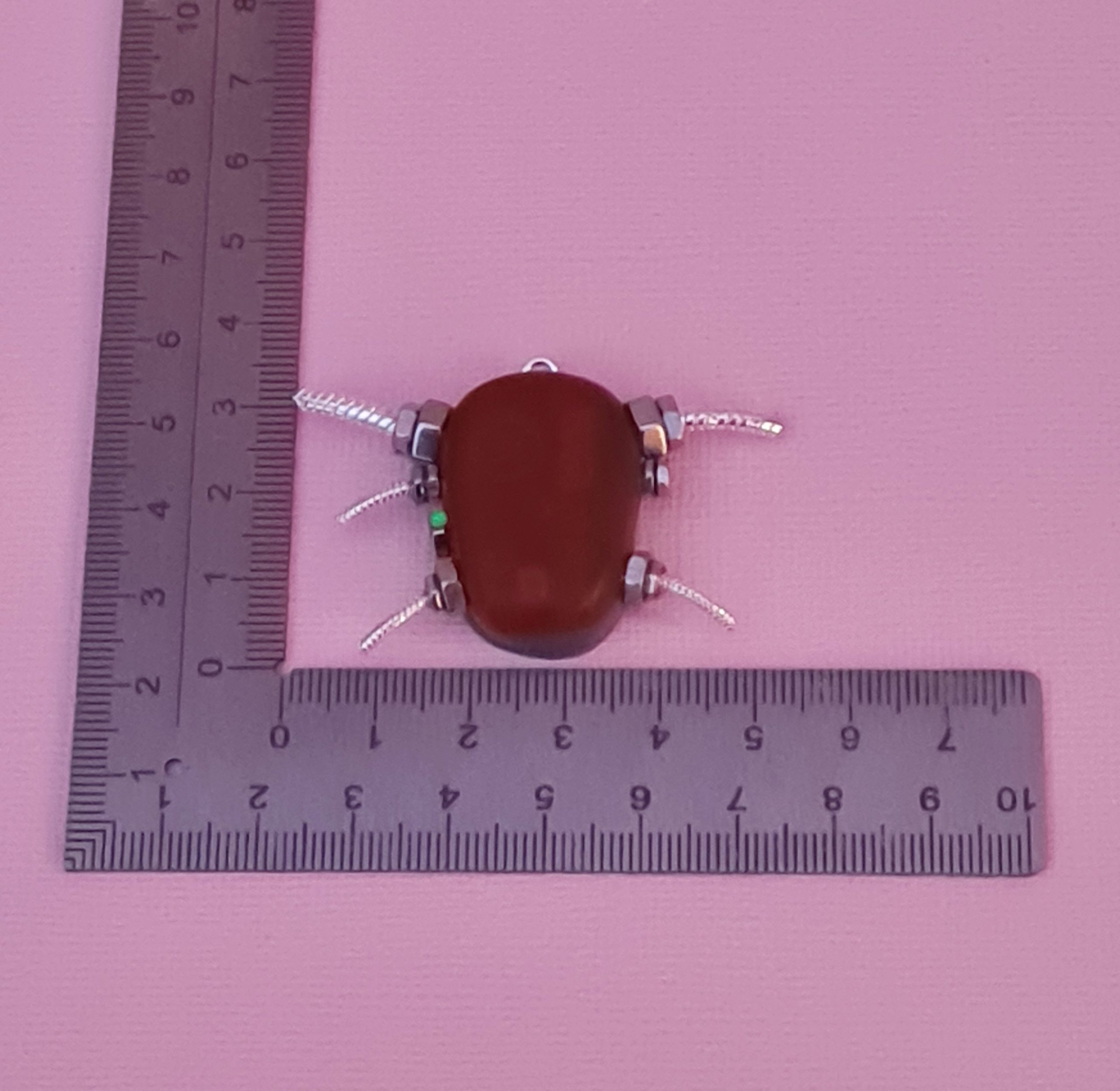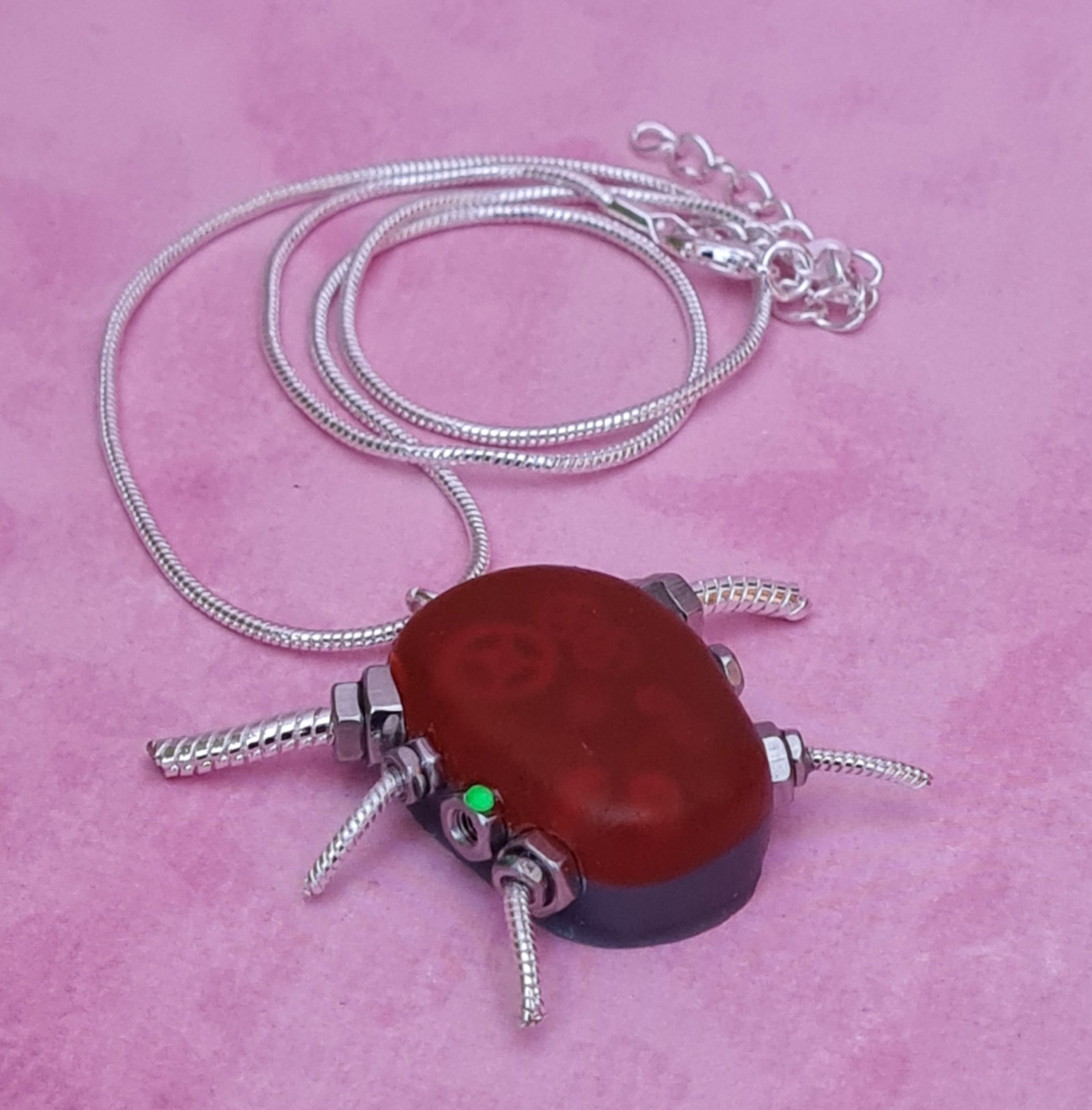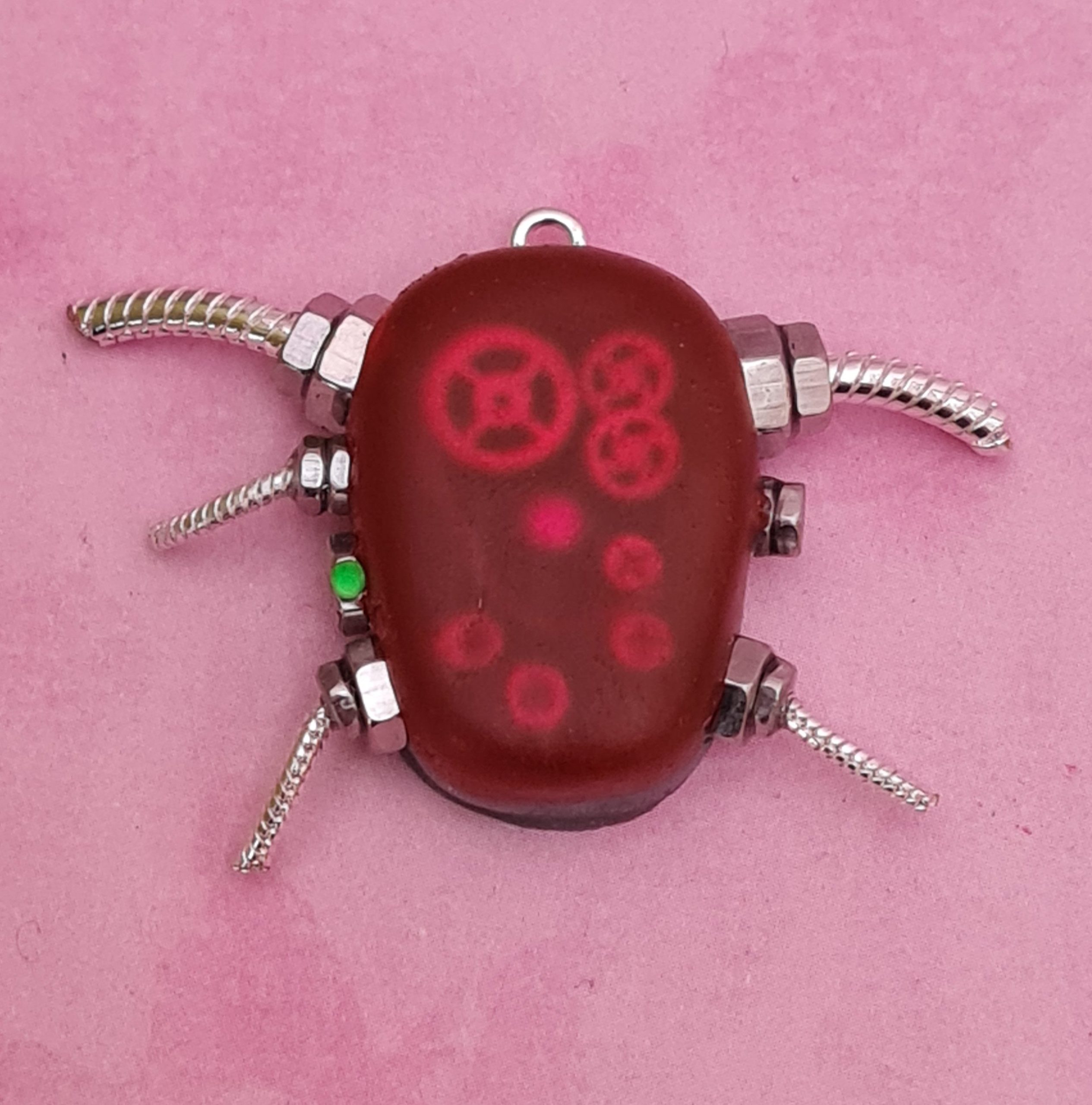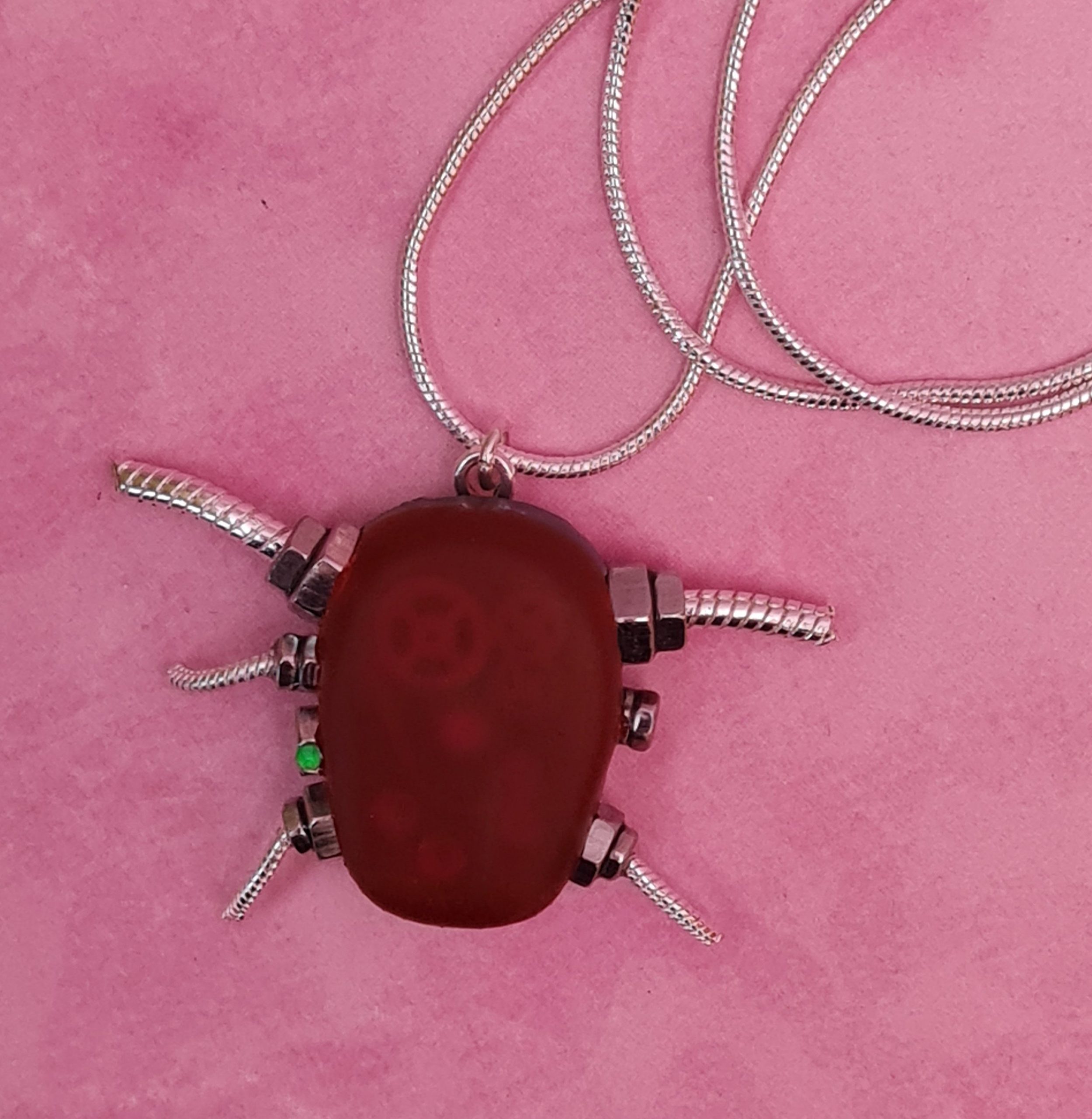 The pendant is dull red at first sight but as it catches the light at an angle, you can see the mechanical workings inside.