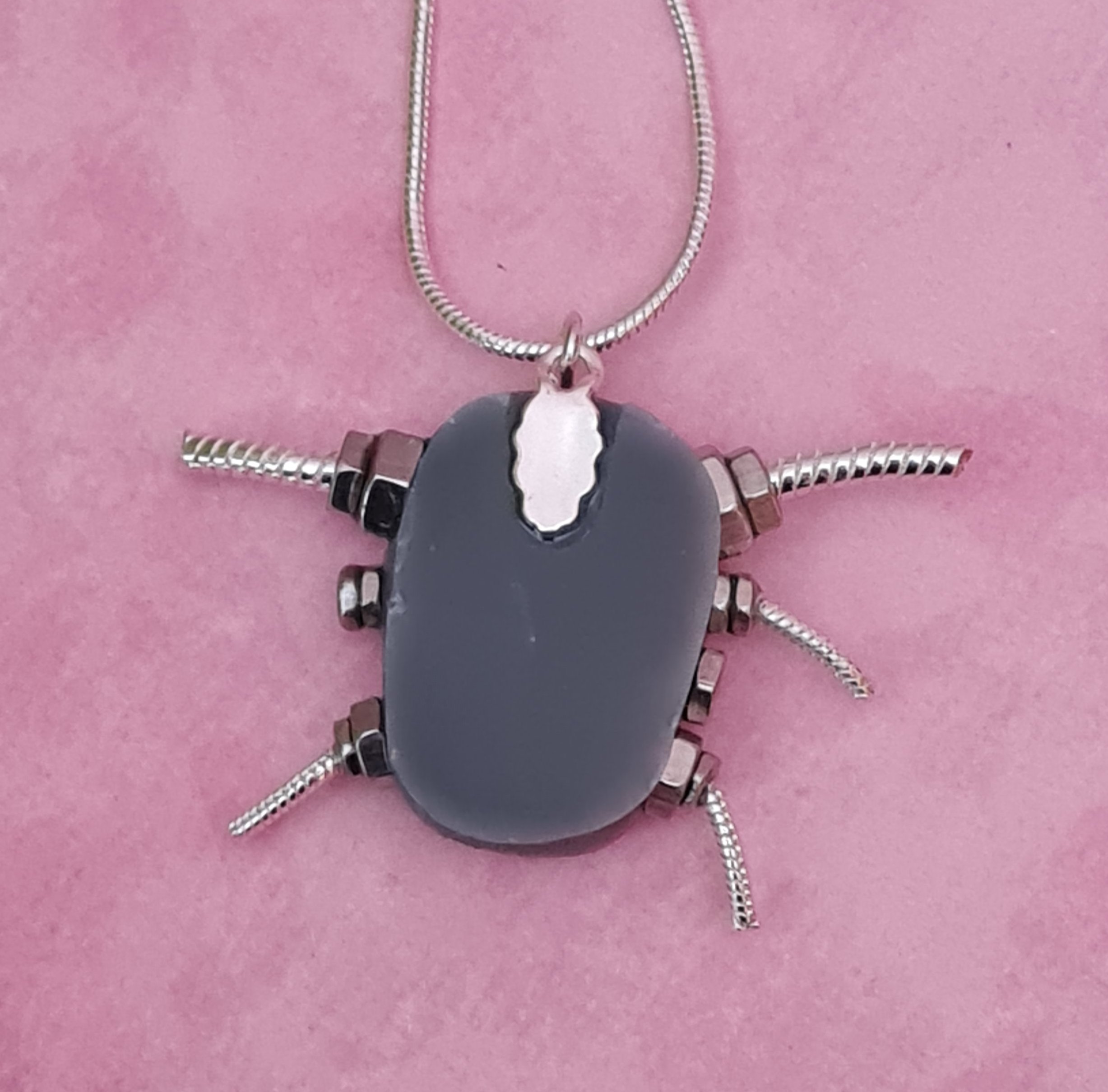 It’s hangs from a silver plated necklace which measures 18″ with a 2″ extension chain (completely nickle free).
