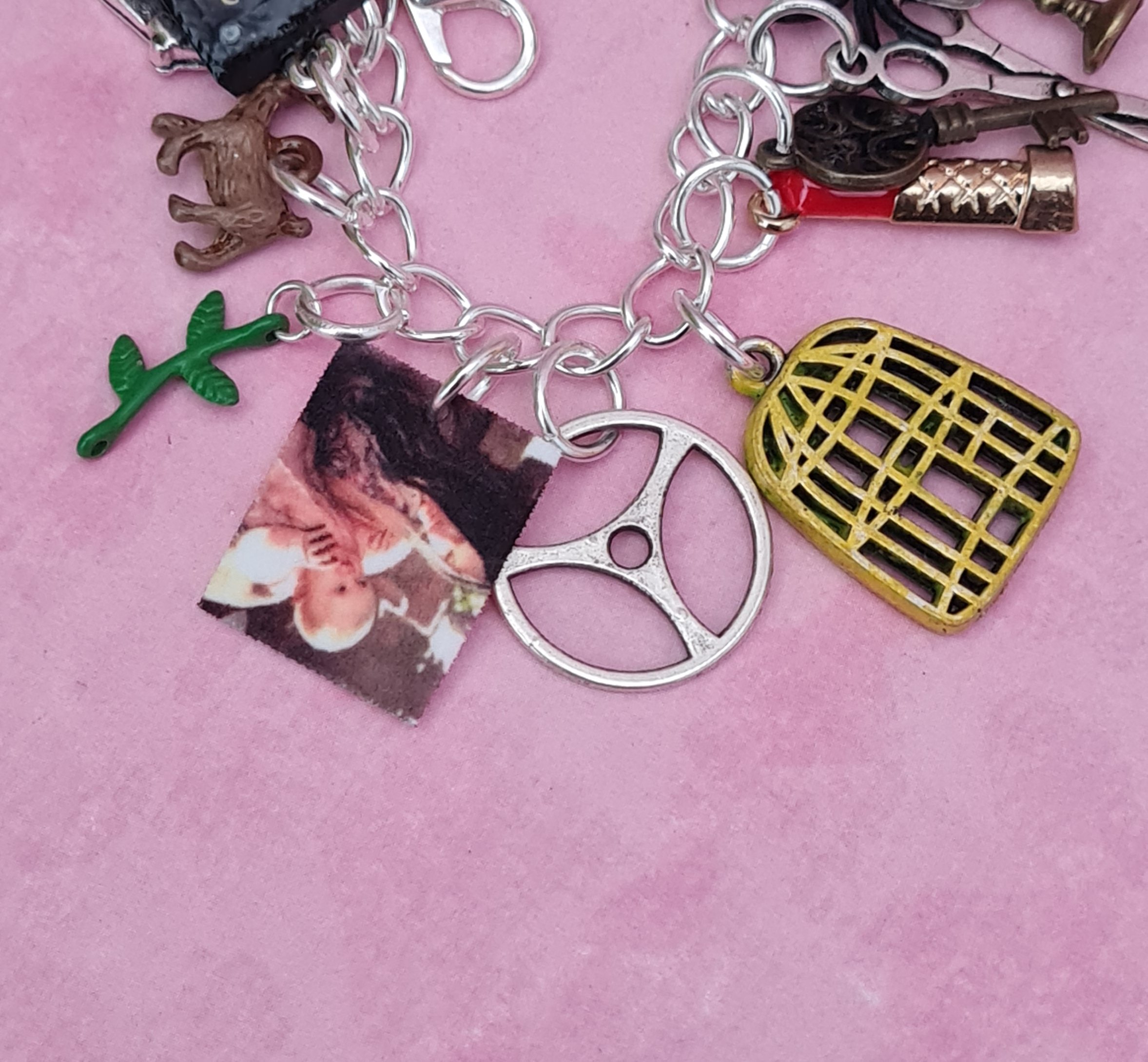 The bracelet is adorned with the following charms: