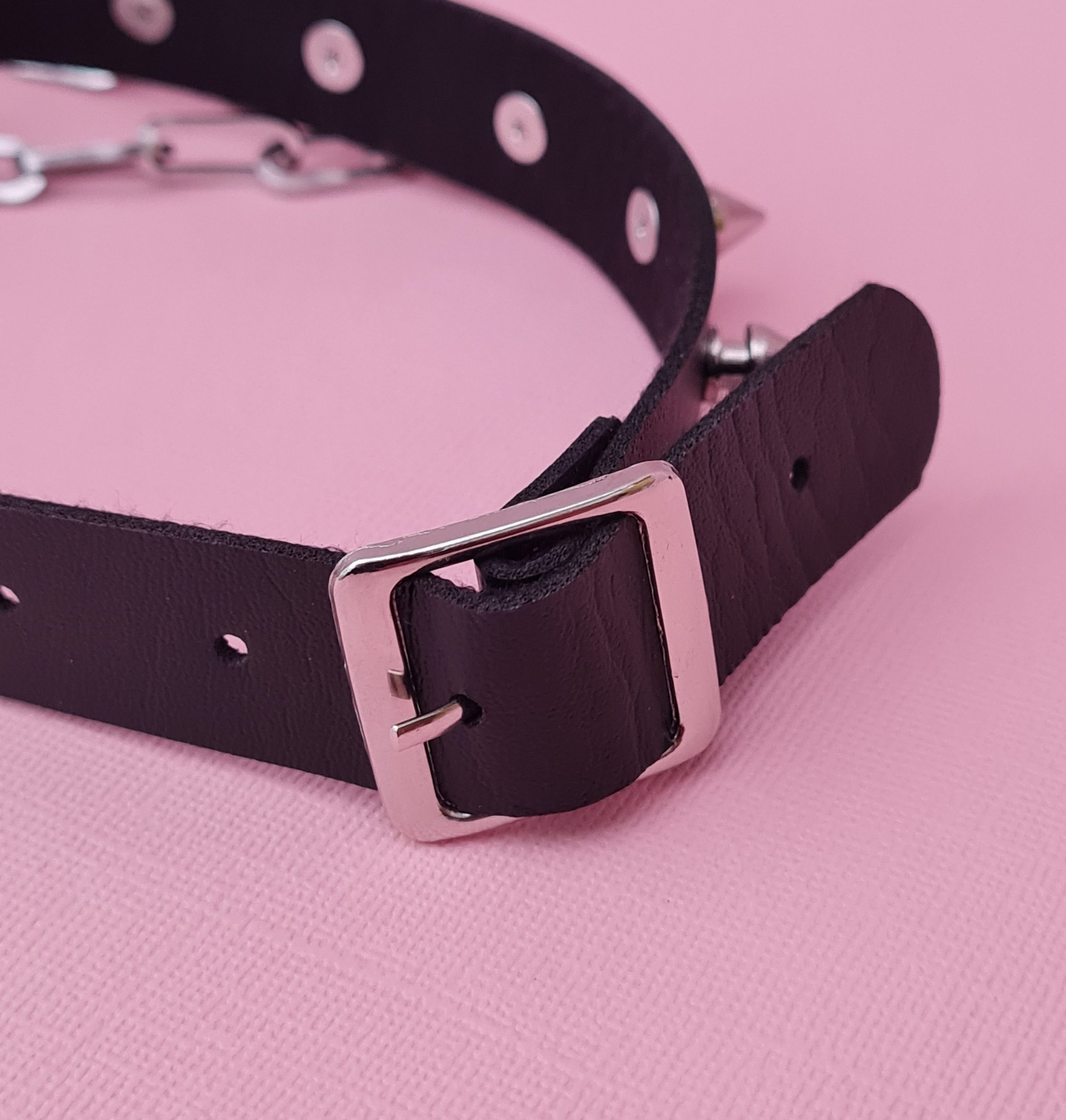 The studded choker is made of pleather with a buckle fastening and will fit necks from 12″ to 16″.